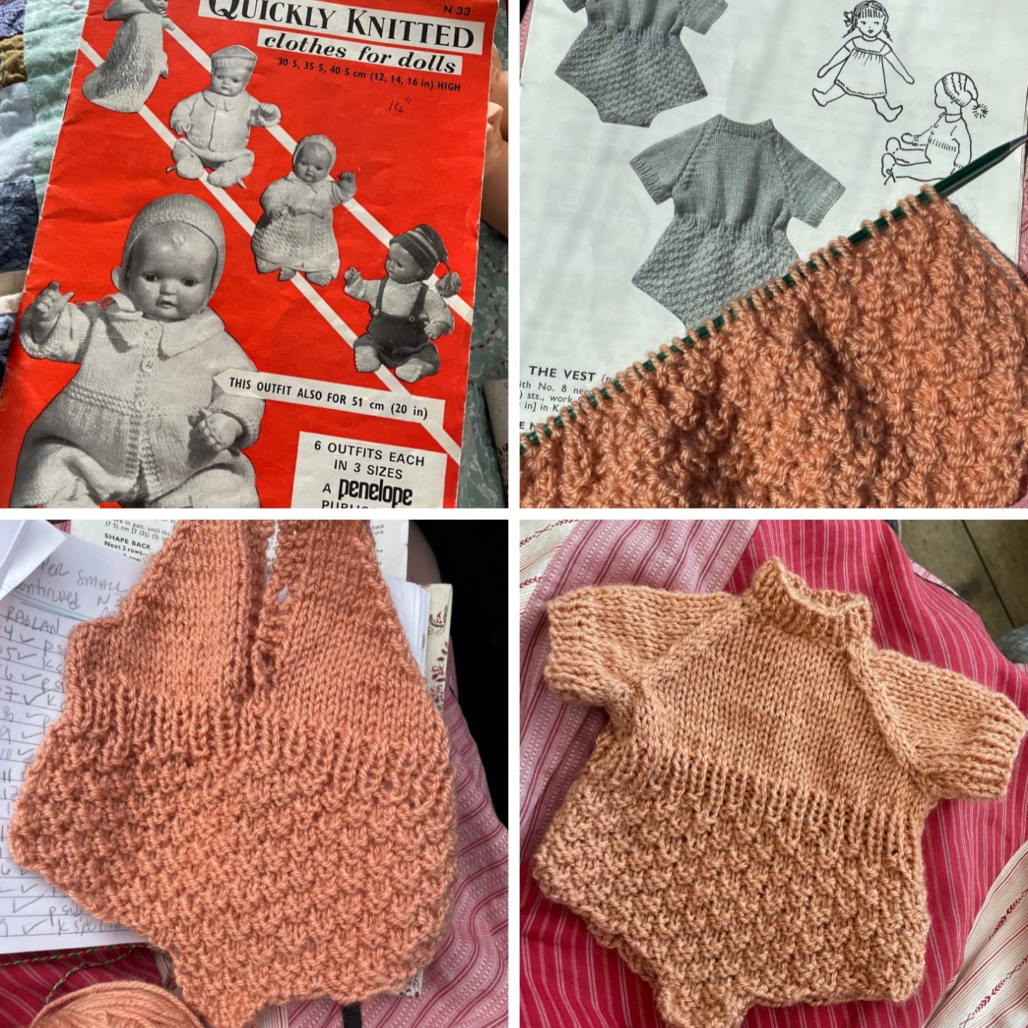 I collect vintage doll clothes knitting patterns and I’m pretty devoted to this one pamphlet by Penelope. I’d always wanted to make the dolly romper featured in it. So, on the way to Lancashire, I started it and finished about a week later while I was chatting with folks at our art exhibition! I LOVE it. I think it will belong to Juliet. I’ve just been looking in my button tins for the perfect tiny buttons to fasten the back.